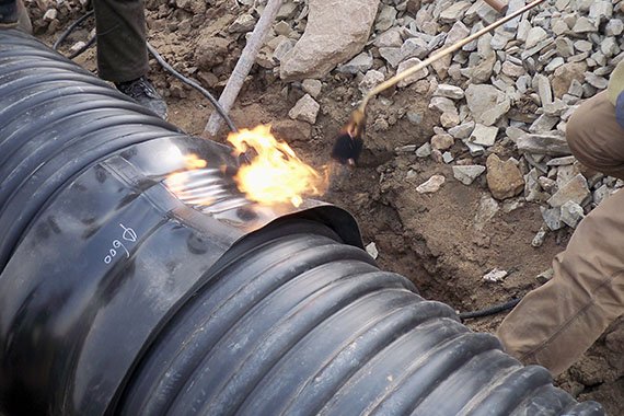 5. 安裝:趁熱將套管移至接頭處居中放置,取出隔離膜,從中間沿圓周方向均勻加熱,使其完全收縮后再分別向兩端延伸加熱。加熱時熱收縮套允許受熱溫度不得超過250℃。待全部收縮完后,再重新加熱表面有酒窩的地方,使其完全平整。整體加熱完畢后,應再重新加熱一遍,以使熱熔膠充分溢出。熱縮過程中用壓輥將熱縮套碾壓幾遍,并重點碾壓熔合搭接處,排除氣泡。熱縮完畢后,進行質量檢查。
